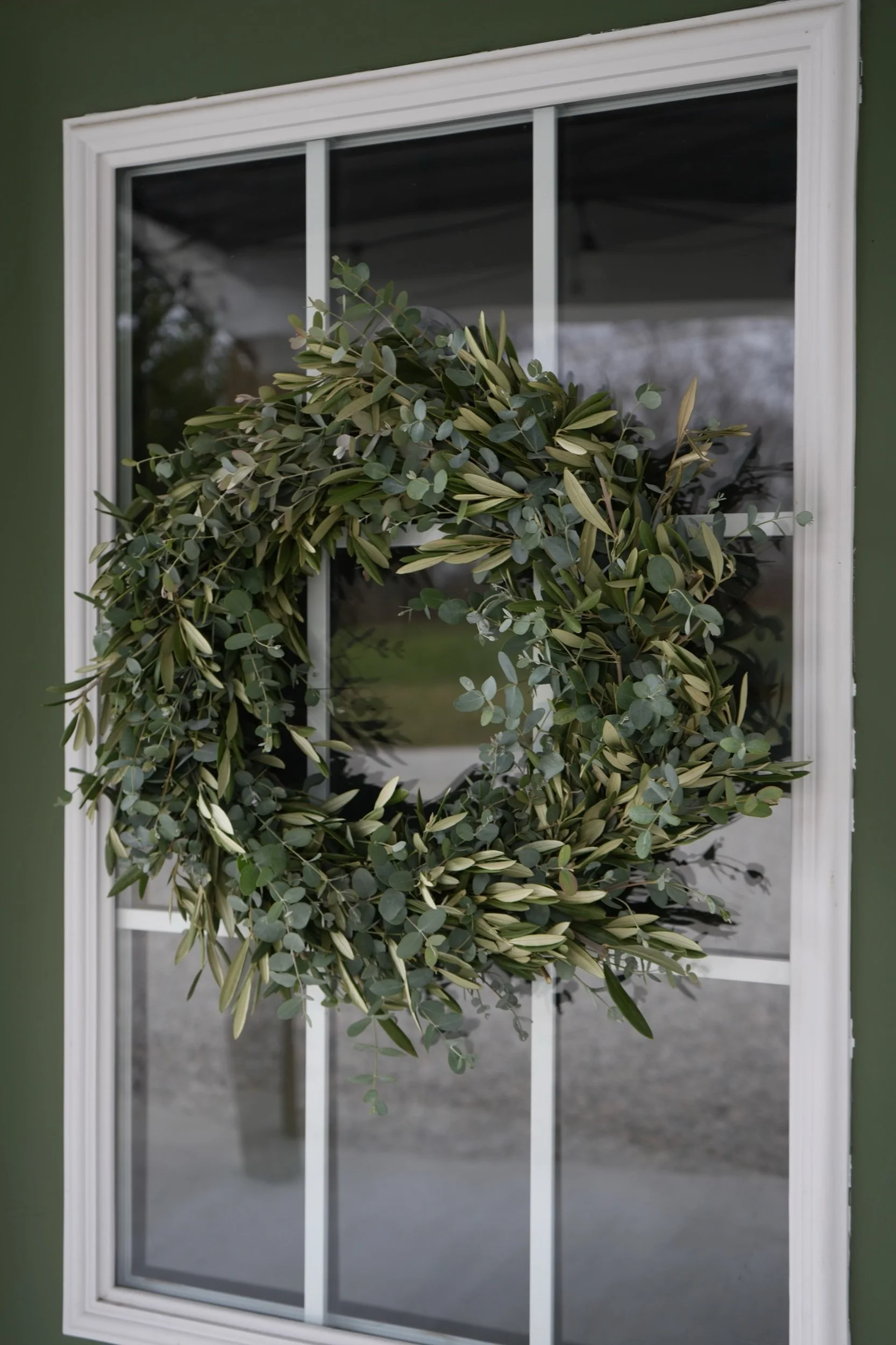 This wreath is a mix of olive and our greenhouse eucalyptus. This wreath is best for indoors or you can hang outside after it’s dried. Is a beautiful dried everlasting wreath if kept indoors. This particular wreath is not available for immediate pick-up or delivery. May need up to a week for processing.